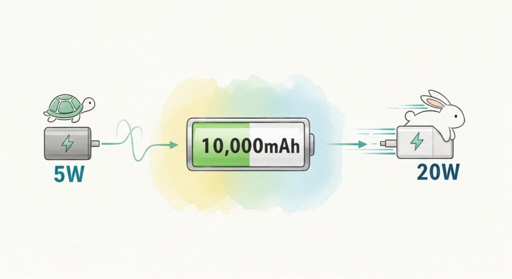 充電時間は、お使いのAC充電器の出力(W数)によって劇的に変わります。10000mAhのモバイルバッテリーを空の状態からフル充電する場合の目安を、W数別にまとめてみました。